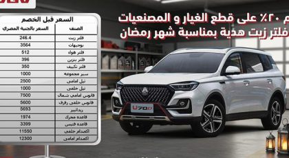 وكانت شركة VGV Egypt قد أعلنت في وقت سابق عن أحدث أسعار سياراتها في السوق المحلي المصري خلال شهر رمضان الجاري وهي سيارة VGV U70p الجديدة كلياً التي يتم استيرادها بالكامل من الصين. وقالت الشركة أن السيارة تتوفر بسبعة مقاعد وتتاح بجميع الكماليات والتجهيزات, كما يتم توفيرها كموديلات 2025. وذكرت أن السيارة حصلت على عرض تخفيض سعري خلال الفترة الحالية ضمن عروض رمضان.