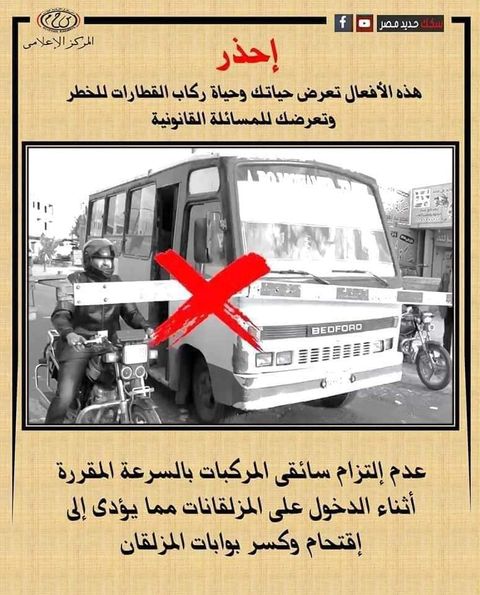 من جديد تستمر الحملات التي تقوم بها وزارة النقل المصرية لتحذير المواطنين من خطورة المعابر غير القانونية على خطوط القطارات والتي تستخدم لعبور السيارات والمركبات والمشاة. وناشدت وزارة النقل المواطنين بضرورة المشاركة في التوعية بضروة الالتزام بعدم اقتحام المزلقان أو السير عكس الاتجاه أثناء غلقه حتى لايؤدي ذلك إلى إزهاق الأرواح وتعطيل مسير القطارات .