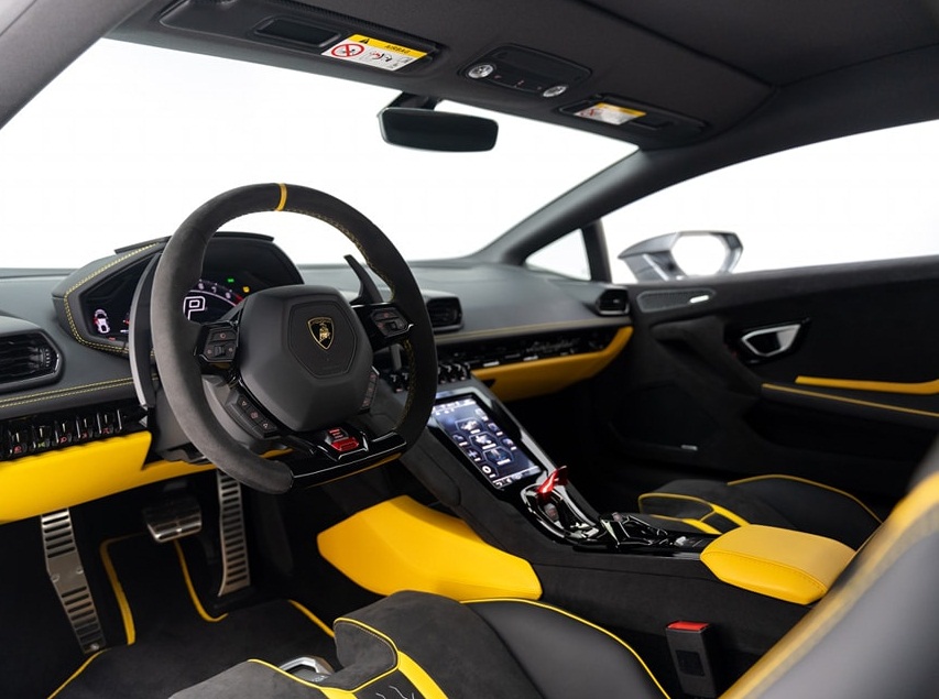 كما يتوفر لها عجلة قيادة بغطاء ألكانتارا ونظام صوت Sesonum راقي ومساند رأس بشعار لامبورجيني وباقة داخلية بلون كرومي داكن وواجهة لامبورجيني الذكية مع كاميرا رؤية خلفية وسنتر لوك باللون الاسود.