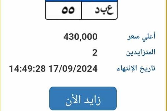 ي د 555 ووصل سعرها الي 100 ألف جنيه وينتهي المزاد عليها في 17 سبتمبر.