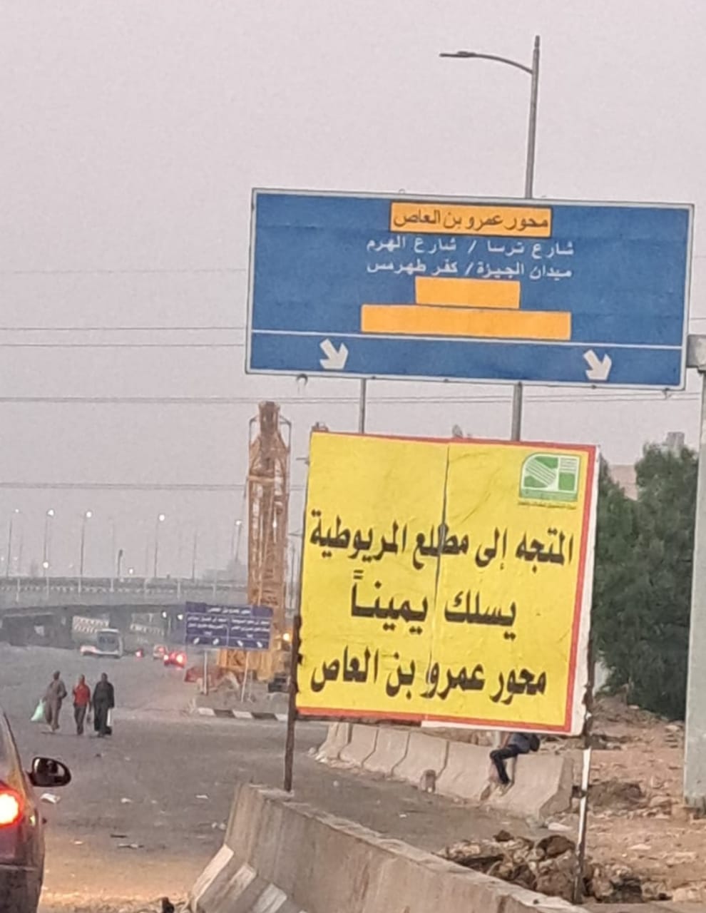 – ثانيا : المركبات القادمة من اعلي المنيب وترغب في استخدام وصلة محور المريوطية للوصول الي القوس الغربي يتم الدخول يمينا الي مدخل محور عمرو بن العاص والسير لمسافة حوالي ??? متر ثم الدوران والعودة مرة اخري اتجاه الدائري ثم استخدام مطلع محور عمرو بن العاص المؤدي الي وصلة المريوطية اتجاه القوس الغربي .