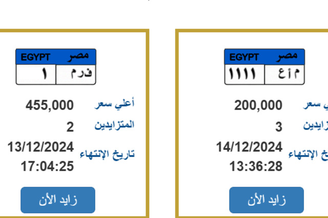م أ ع 1111 بسعر يبلغ 200 ألف جنيه وعدد 3 متزايدين . وسينتهي المزاد علي اللوحة في يوم 14 ديسمبر 2024.