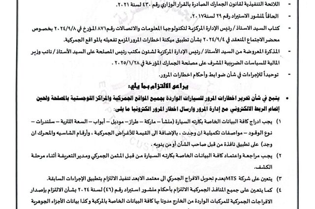 كما يتعين على شركة MTS بعدم تحويل الافراج الجمركي الي معتمد الا بعد تنفيذ الالتزام بتطبيق الاجراءات السابقة. كما يتعين على جميع المنافذ الجمركية الالتزام بأحكام منشور استيراد رقم 46 لسنة 2024 بشأن الالتزام باصدار الافراجات الجمركية للمركبات الواردة من الخارج ومدون بها كافة البيانات الخاصة بالمركبة وكذلك بيانات الاجزاء الجوهرية للمركبة برقم الشاسيه ورقم الموتور .