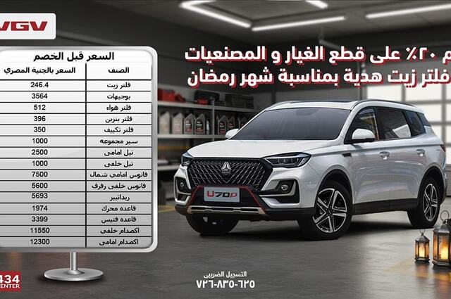وكانت شركة VGV Egypt قد أعلنت في وقت سابق عن أحدث أسعار سياراتها في السوق المحلي المصري خلال شهر رمضان الجاري وهي سيارة VGV U70p الجديدة كلياً التي يتم استيرادها بالكامل من الصين. وقالت الشركة أن السيارة تتوفر بسبعة مقاعد وتتاح بجميع الكماليات والتجهيزات, كما يتم توفيرها كموديلات 2025. وذكرت أن السيارة حصلت على عرض تخفيض سعري خلال الفترة الحالية ضمن عروض رمضان.