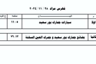 كما تتضمن بضائع جمرك تفتيش الركاب والبيوع الجمركية قطع غيار سيارات متنوعة. وأوضحت اللجنة المشرفة على المزاد أن بعض السيارات المطروحة للتزايد ترخص والبعض الآخر لا يرخص، وذلك كما هو موضح بحالة كل لوط على حدا في كراسة الشروط. ويشترط لدخول المزاد شراء كراسة الشروط وقيمتها 400 جنيه وتباع بمقر الهيئة العامة للخدمات الحكومية في أبراج وزارة المالية بامتداد شارع رمسيس برج 2؛ وقيمتها لا ترد في حال عدم الحصول على أي من المعروض بالمزاد.